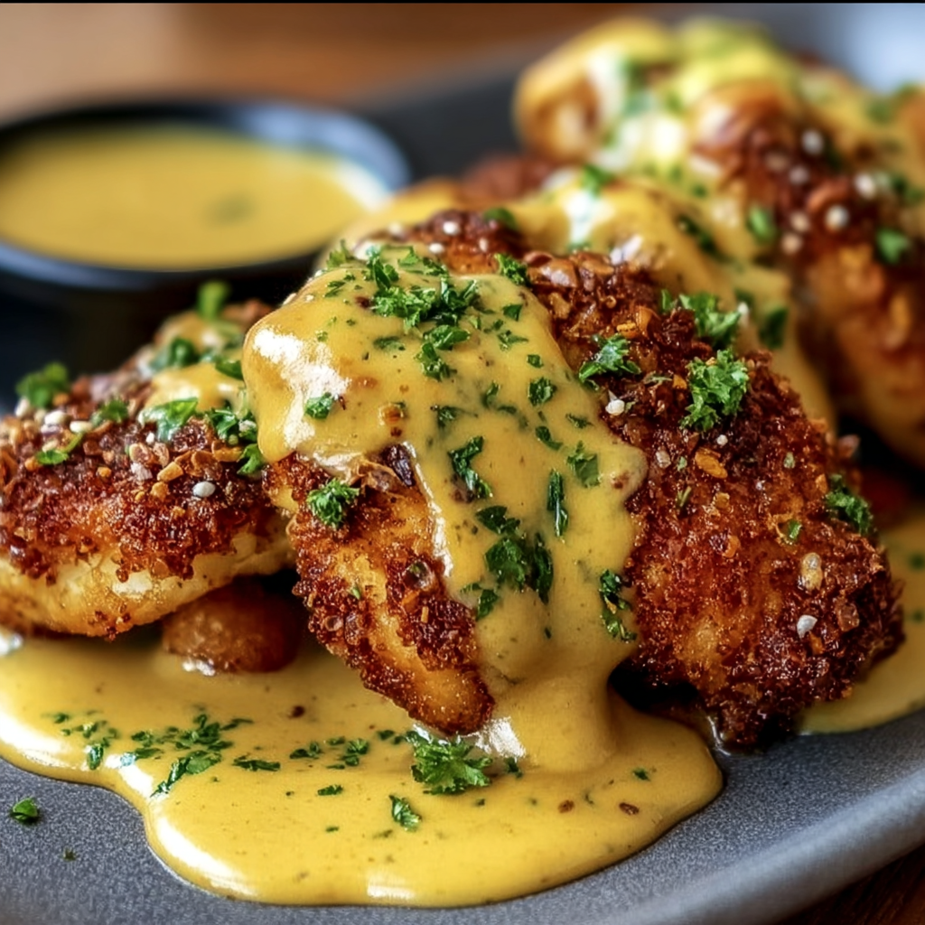 Pretzel Chicken with Mustard-Cheddar Sauce
