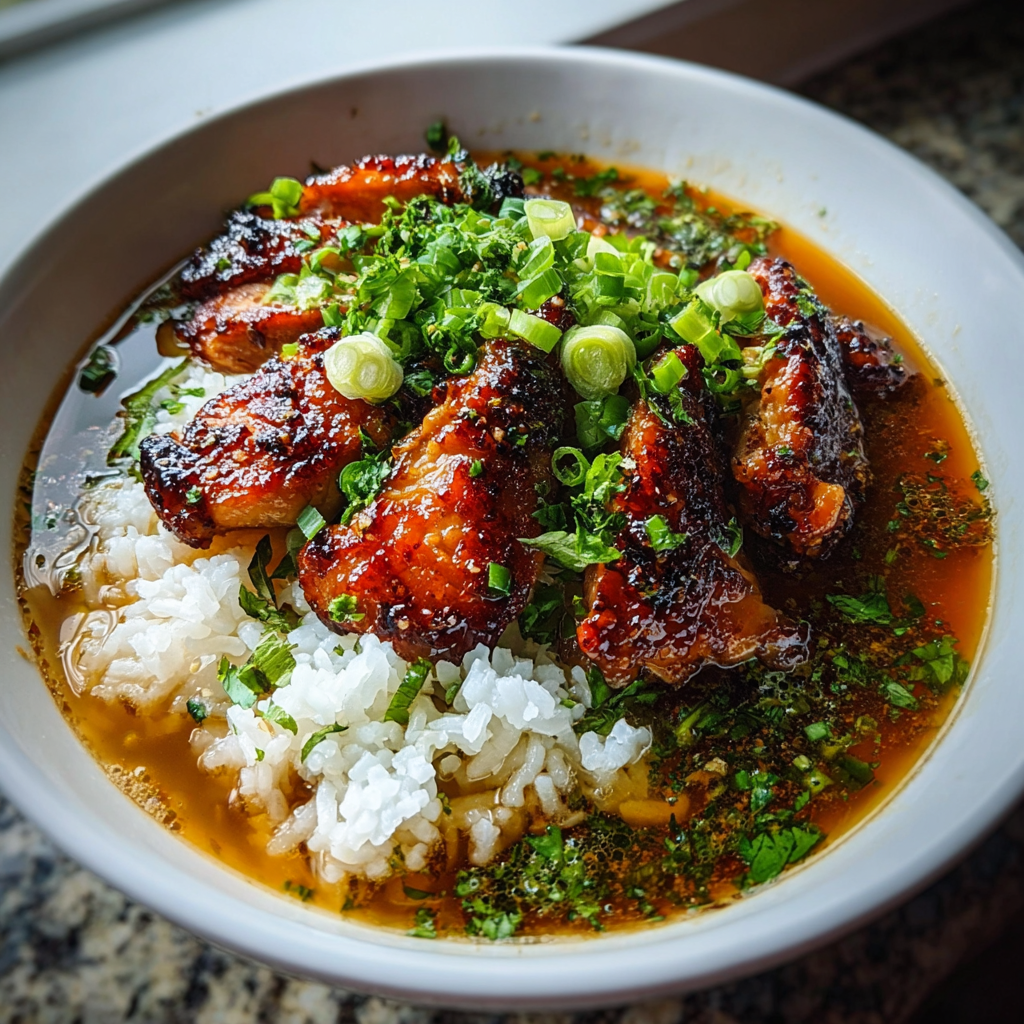 - Assemble your bowl: Place cooked rice in a warm bowl, add the sliced chicken neatly beside it, and ladle the hot garlic-ginger broth around the edges — enough to soak the rice but not drown it. Sprinkle with chopped green onions and toasted sesame seeds. Optional: sprinkle chili flakes if you like some heat.