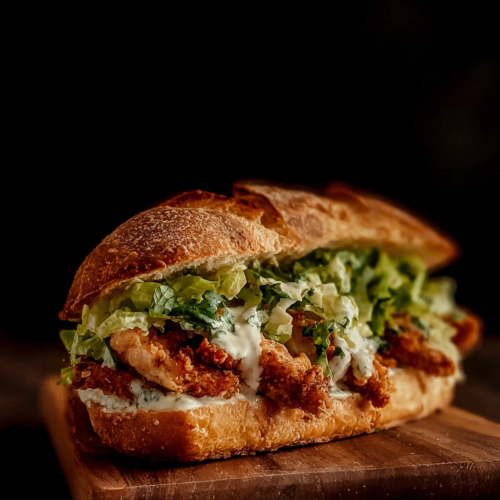 - Assemble the Sandwich: Spread a good amount of Caesar dressing on the bottom half of the bread. Carefully place the fried chicken on top, followed by a heap of chopped romaine lettuce.
